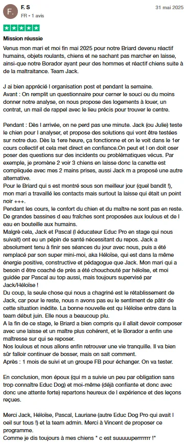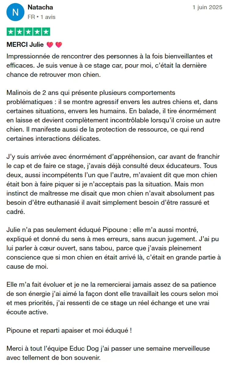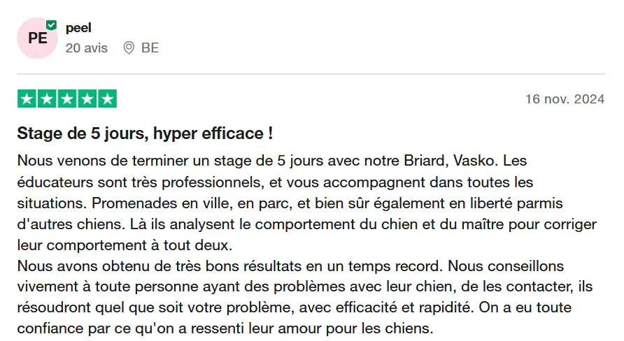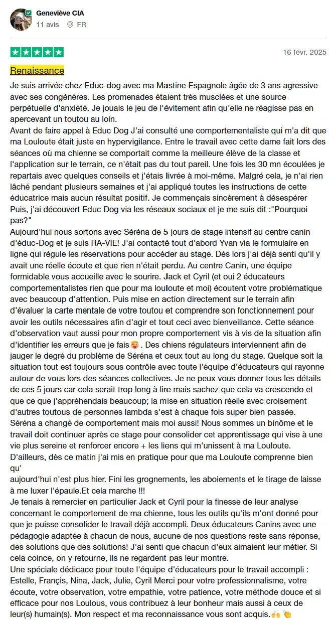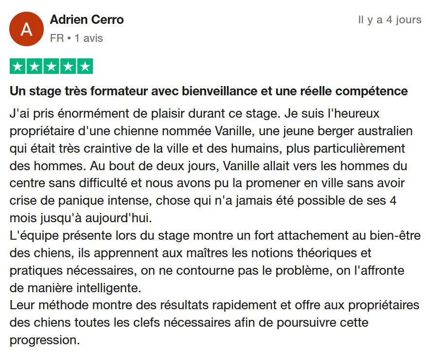 1 éducateur comportementaliste canin dédié : Vos séances individuelles sont avec un éducateur comportementaliste canin dédié qui va vous suivre pendant l'ensemble de vos séances pour garantir un suivi et une chronologie pendant votre stage.